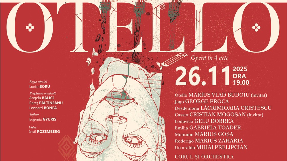 "Otello" de Giuseppe Verdi este spectacolul propus astăzi, 26 noiembrie 2025, de Opera Națională Română din Timișoara.