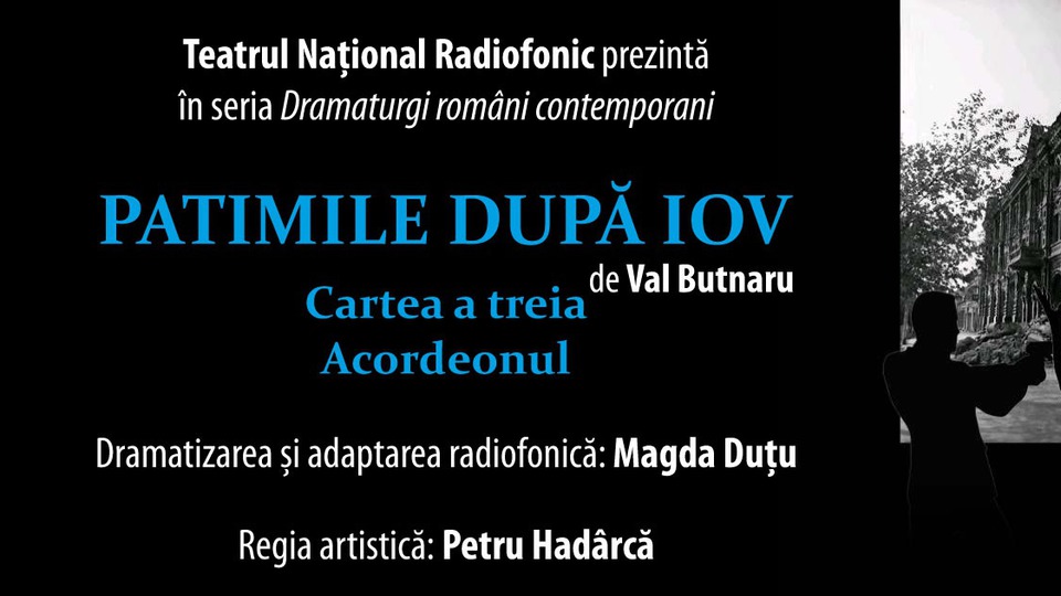 Teatrul Național Radiofonic prezintă în premieră, joi, 27 noiembrie, de la ora 19:00, la Radio România Cultural, Patimile după Iov de Val Butnaru. Cartea a treia - Acordeonul. Dramatizarea și adaptarea radiofonică: Magda Duțu. Regia artistică: Petru Hadârcă. În distribuție: Dorel Vișan, Gabriela Popescu, Angela Ciobanu, Dan Melnic, Anatol Durbală, Petru Hadârcă, Marcelo Cobzariu, Diana Decuseară, Corina Rotaru, Ion Mocanu, Alexandru Pleșca, Mircea Constantinescu, Annemary Ziegler, Daniel Tudorică, Cristina Constantinescu, Alexandru Nedelcu. Asistența tehnică: Dragoș Niță. Regia de studio: Milica Creiniceanu. Regia muzicală: Luiza Mateescu. Regia tehnică: inginer Mirela Georgescu. Redactor: Ion-Costin Manoliu. Coordonator de proiect: Magda Duțu.