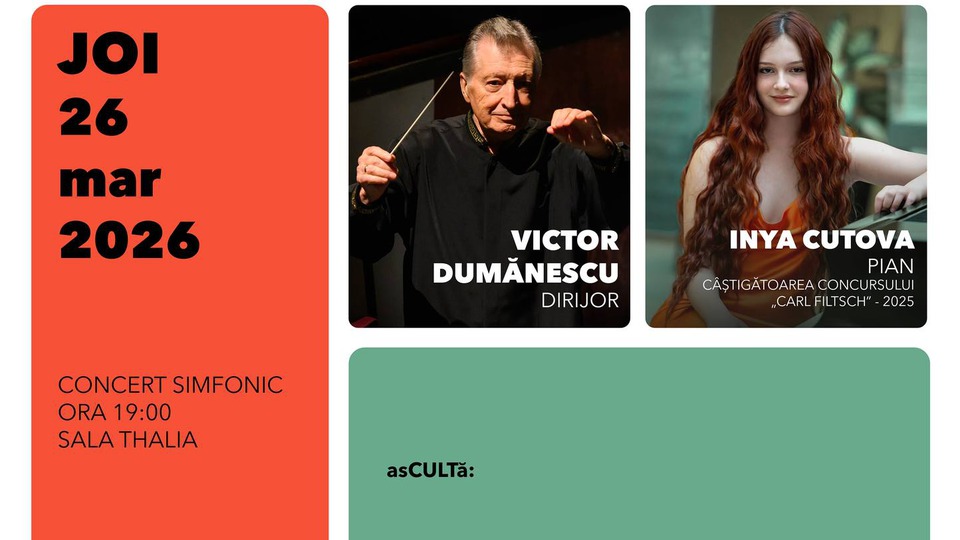 Pianista Inya Cutova, câștigătoarea Concursului-Festival Internațional de Interpretare Pianistică și Compoziție „Carl Filtsch” din 2025, este astăzi, 26 martie, solista concertului Orchestrei Filarmonicii din Sibiu. Muziciana interpretează partitura solistică a Concertului nr. 1 pentru pian și orchestră de Frédéric Chopin. De asemenea, sub bagheta lui Victor Dumănescu, ansamblul amintit va mai prezenta Uvertura operei „La Clemenza di Tito” de Wolfgang Amadeus Mozart și Simfonia în do major de Georges Bizet. Ora de începere este 19:00.