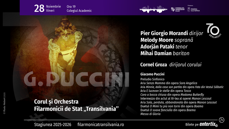Concertul de vineri, 28 noiembrie 2025 (ora 19.00 / Colegiul Academic) își propune să dezvăluie câteva dintre fațetele mai puțin cunoscute ale geniului puccinian, dincolo de aura sa consacrată de compozitor de operă. Alături de Corul și Orchestra Filarmonicii de Stat "Transilvania", pe scena sălii Auditorium Maximum vor urca soliștii Melody Moore (soprană), Adorján Pataki (tenor) și Mihai Damian (bariton), proaspătul câștigător al ediției din acest an a celebrului concurs Operalia, sub bagheta dirijorului Pier Giorgio Morandi, dirijorul Corului Filarmonicii fiind Maestrul Cornel Groza.