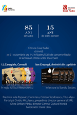 Vă așteptăm, joi, 31 octombrie a.c., ora 14, în foaierul Sălii Radio, din str. G-ral Berthelot, nr. 60-64, la sărbătorirea celor 85 de ani ai Radio România și 15 ani ai Editurii Casa Radio prin lansarea edițiilor sonore integrale ale celor doi "clasici fără vârstă": Caragiale și Creangă.