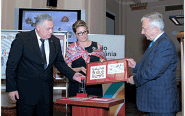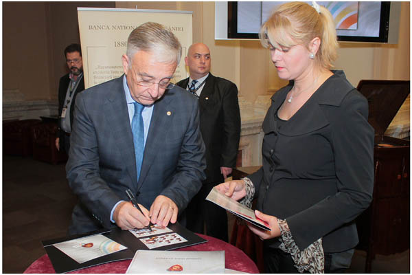 Doamna Cristina Popescu, Director General Romfilatelia, a mulțumit celor care au sprijinit realizarea emisiunii de mărci poștale Fonoteca de aur a României și i-a invitat pe domnul Mugur Isărescu și pe domnul Ovidiu Miculescu, Președinte Director General al Radio România, să semneze emisiunea de mărci poștale și să aplice ștampilele pe emisiunea Prima zi.