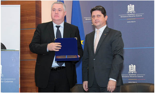 În încheierea conferinței Radio România - 85 de ani: o istorie în slujba politicii externe românești domnul Titus Corlățeanu, Ministrul Afacerilor Externe, a oferit o plachetă aniversară domnului Ovidiu Miculescu, Președinte Director General al Radio România.