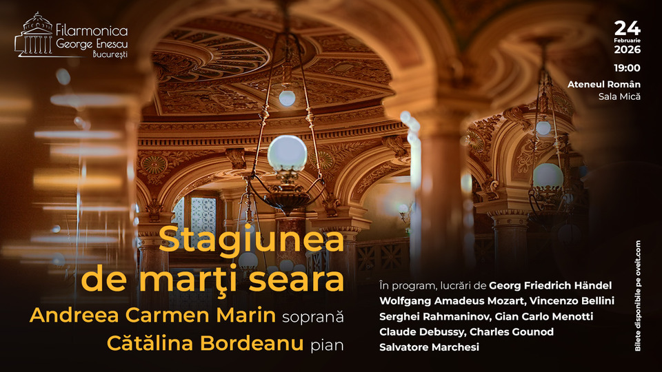 Soprana Andreea Carmen Marin și pianista Cătălina Bordeanu vor susține astăzi, 24 februarie 2026, un recital în cadrul "Stagiunii de marți seara" a Filarmonicii bucureștene.