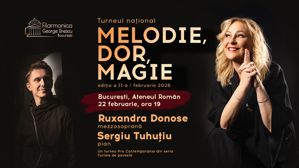 Turneul național Melodie, Dor, Magie - ediția a doua - ajunge la București pe 22 februarie 2026, de la ora 19:00, la Ateneul Român, cu un recital susținut de mezzosoprana Ruxandra Donose și pianistul Sergiu Tuhuțiu.