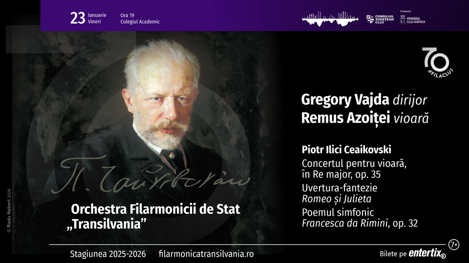 Gregory Vajda, noul Dirijor Principal al Orchestrei Filarmonicii de Stat "Transilvania" revine la pupitrul acesteia pentru a dirija, vineri, 23 ianuarie 2026, ora 19.00 / Colegiul Academic, o serie de lucrări semnate de Piotr Ilici Ceaikovski - Concertul pentru vioară, în Re major, op. 35, Uvertura-fantezie Romeo și Julieta și Poemul simfonic Francesca da Rimini, op. 32. Solistul serii va fi bine cunoscutul violonist Remus Azoiței, care revine, de asemenea, pe scena sălii Auditorium Maximum.