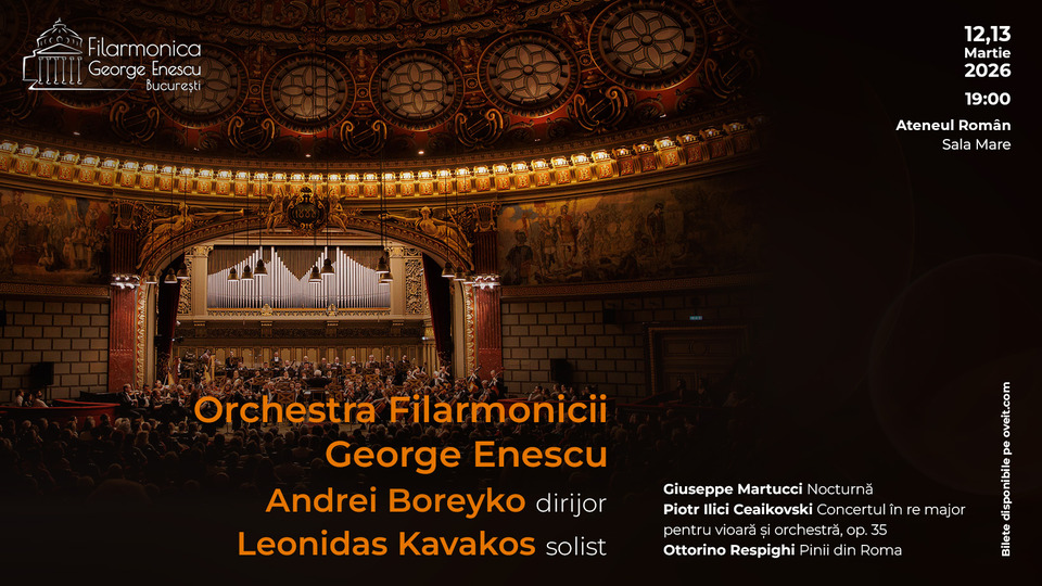 Orchestra Filarmonicii George Enescu, sub bagheta renumitului Andrei Boreyko, va evolua pentru prima oară împreună cu strălucitul violonist Leonidas Kavakos, în două concerte simfonice sold-out, pe 12 și 13 martie. Programul promite o experiență poetică și captivantă care explorează toate stările sufletului omenesc: Nocturnă de Martucci, Concertul în re major pentru vioară și orchestră, op. 35 de Ceaikovski și Pinii din Roma de Respighi.