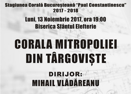 Corul Mitropoliei din Târgoviște condus de Mihail Vlădăreanu sustine un concert la Biserica "Sf. Elefterie" din București astăzi, 13 noiembrie 2017, de la ora 19,00. Ansamblul este alcătuit din 38 de membri, de formație teologică sau muzicală, care participă la importante festivaluri și concursuri, din țară și din străinătate, înregistrând până acum trei discuri cu lucrări sacre și laice românești și universale.