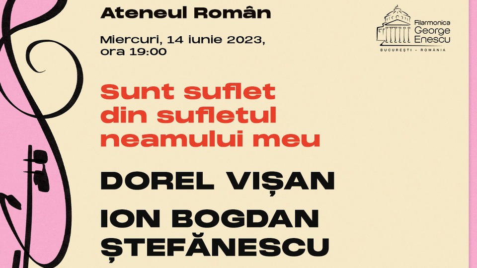 La Ateneul Român poate fi urmărit astăzi, 14 iunie 2023, un recital de muzică și poezie intitulat „Sunt suflet din sufletul neamului meu”. Protagoniști: actorul Dorel Vișan și flautistul Ion Bogdan Ștefănescu. Vor fi recitate versuri de Mihai Eminescu, George Coșbuc și Lucian Blaga, însoțite de lucrări muzicale precum „La margine de vânt”, „Dizzy Flute” sau „Cavalcada” semnate de Ion Bogdan Ștefănescu. Ora de începere: 19:00.