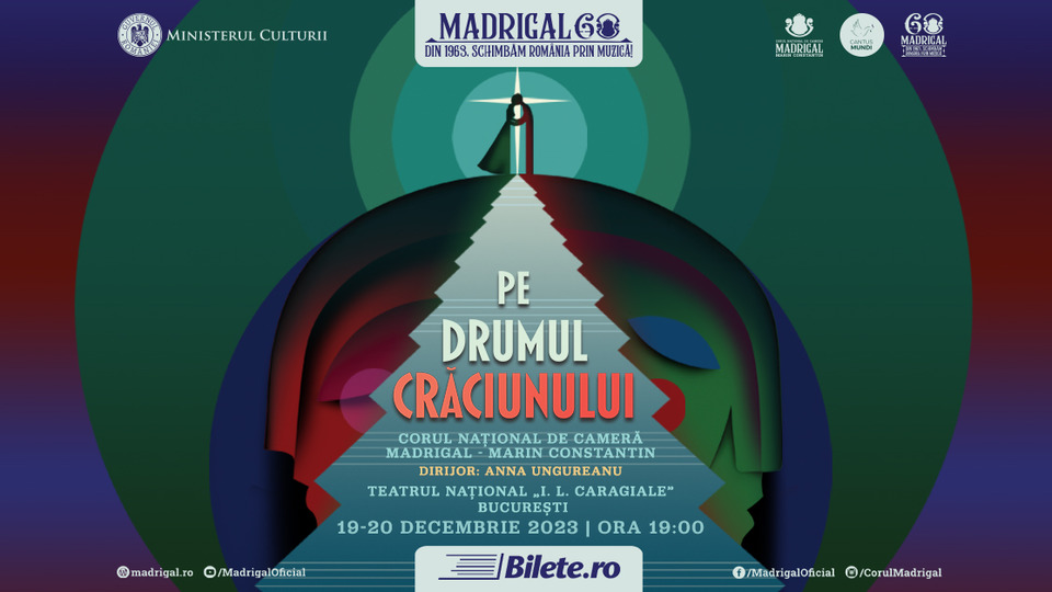Corul Național de Cameră "Madrigal - Marin Constantin", dirijat de Anna Ungureanu, împreună cu actorii Ofelia Popii și Marius Turdeanu, evoluează astăzi, 20 decembrie, în spectacolul "Pe drumul Crăciunului", pe scena Teatrului Național din București.