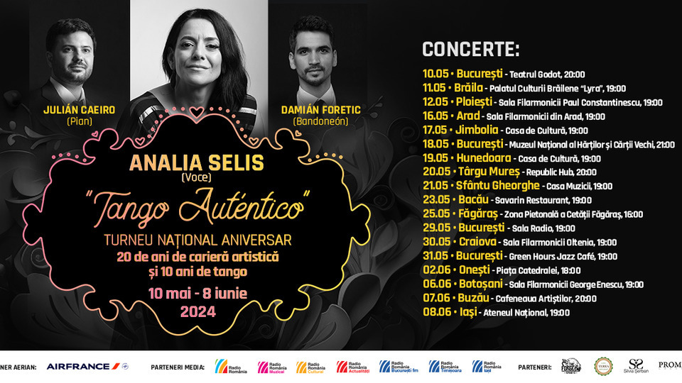 Turneul național aniversar "Tango Auténtico", derulat de vocalista Analia Selis, ajunge astăzi, 6 iunie 2024, la Sala Filarmonicii "George Enescu" din Botoșani.