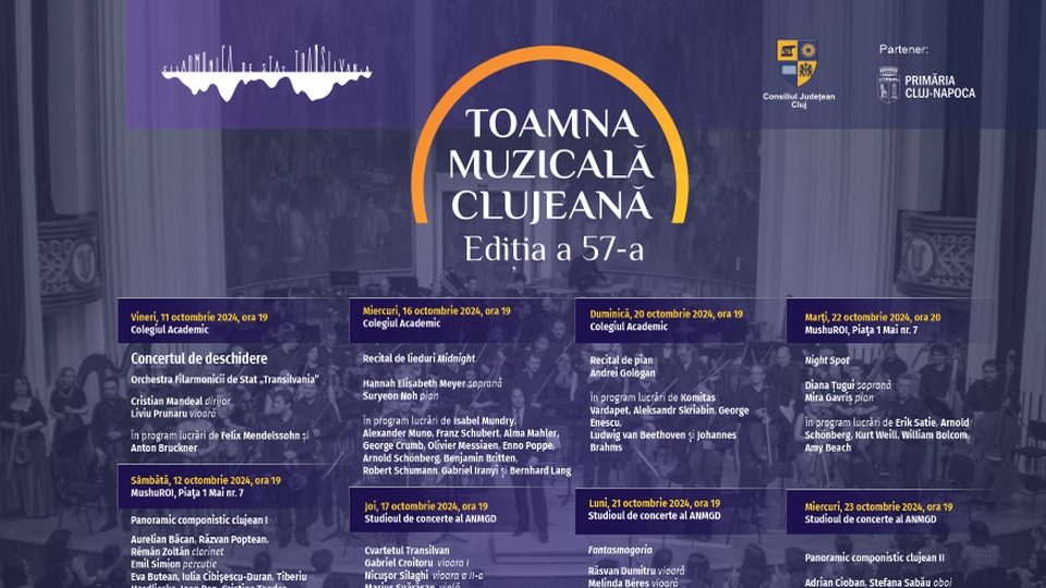 Pe agenda Festivalului "Toamna Muzicală Clujeană", ediția a 57-a, se regăsește astăzi, 23 octombrie 2024, un eveniment intitulat "Panoramic componistic clujean II".