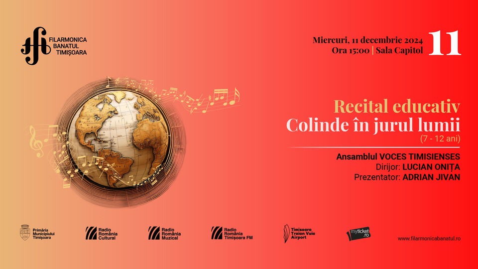 Filarmonica "Banatul" din Timișoara propune celor mici astăzi, 11 decembrie 2024, un recital educativ intitulat "Colinde în jurul lumii!".