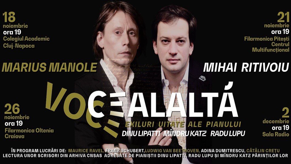 Sala Radio din București găzduiește astăzi, 2 decembrie 2025, de la ora 19.00, spectacolul final din cadrul Turneului Național "Cealaltă voce. Exiluri uitate ale pianului", susținut de pianistul Mihai Ritivoiu și actorul Marius Manole.