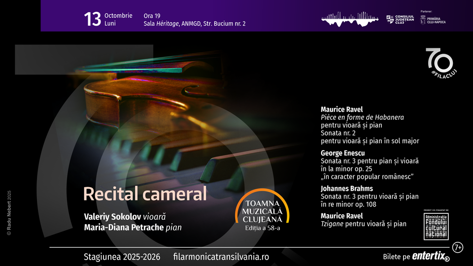 Melomanii clujeni sunt invitați mâine, 13 octombrie 2025, ora 19.00, în sala Héritage a ANMGD, str. Bucium nr. 2 pentru a-i asculta, într-un recital cameral, pe Valeriy Sokolov (vioară) și Maria-Diana Petrache (pian). Din programul serii de luni vor face parte lucrări compuse de Maurice Ravel, George Enescu și Johannes Brahms.