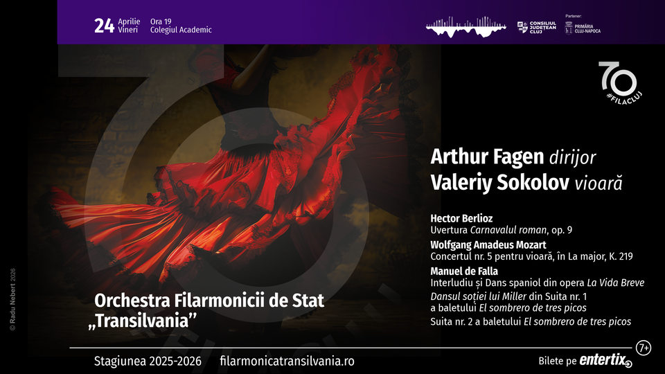 În ultima zi de vineri a lunii aprilie, mai precis în data de 24 aprilie 2026 (ora 19.00 / Colegiul Academic) melomanii sunt invitați în sala Auditorium Maximum pentru a asculta lucrări semnate de Hector Berlioz, Wolfgang Amadeus Mozart și Manuel de Falla, în interpretarea Orchestrei Filarmonicii de Stat "Transilvania" sub bagheta dirijorului american Arthur Fagen. Solistul serii va fi violonistul Valeriy Sokolov care revine la Cluj, de această dată pe scena concertistică. El a fost prezent în orașul nostru, în luna octombrie a anului trecut, când a susținut, alături de pianista Maria-Diana Petrache, un recital în cadrul Festivalului Toamna Muzicală Clujeană.