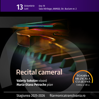 Melomanii clujeni sunt invitați mâine, 13 octombrie 2025, ora 19.00, în sala Héritage a ANMGD, str. Bucium nr. 2 pentru a-i asculta, într-un recital cameral, pe Valeriy Sokolov (vioară) și Maria-Diana Petrache (pian)