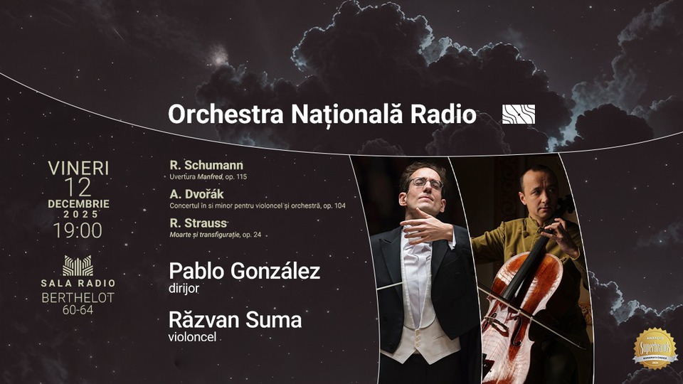 Concertul Orchestrei Naționale Radio. Dirijor: Pablo González. Solist: Răzvan Suma - violoncel. Robert Schumann - Uvertura Manfred op. 115; Antonin Dvoűák - Concertul op. 104 în si minor pentru violoncel și orchestră; Richard Strauss - Moarte și transfigurație op. 24.