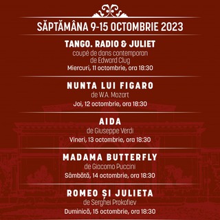 Agenda de concert"Tango. Radio & Juliet", "Nunta lui Figaro", "Aida", "Madama Butterfly" și "Romeo și Julieta", pe scena ONB