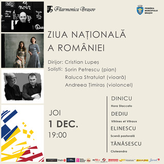 Joi, 1 decembrie, Filarmonica Brașov invite melomanii din oraș la un concert dedicat Zilei Naționale a României. |