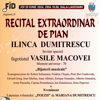 Joi, 20 iunie 2024, ora 19.00, Sala Lahovari - Filarmonica "Ion Dumitrescu" |