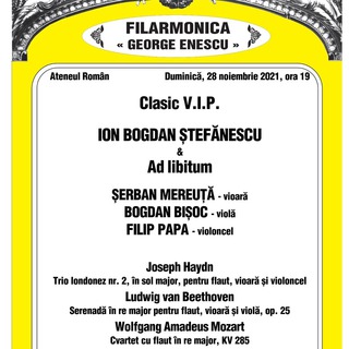 Recitalul cameral "Clasic V.I.P", din 28 noiembrie, ora 19.00, de la Ateneul Român, reunește două nume consacrate ale vieții muzicale din România: flautistul Ion Bogdan Ștefănescu și cvartetul Ad libitum |