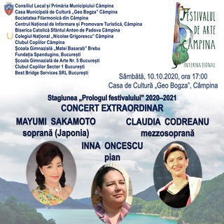 Agenda de concertStagiunea 'Prologul festivalului' 2020-2021. Concert extraordinar - Mayumi Sakamoto, soprană (Japonia), Claudia Codreanu, mezzosoprană, Inna Oncescu, pian