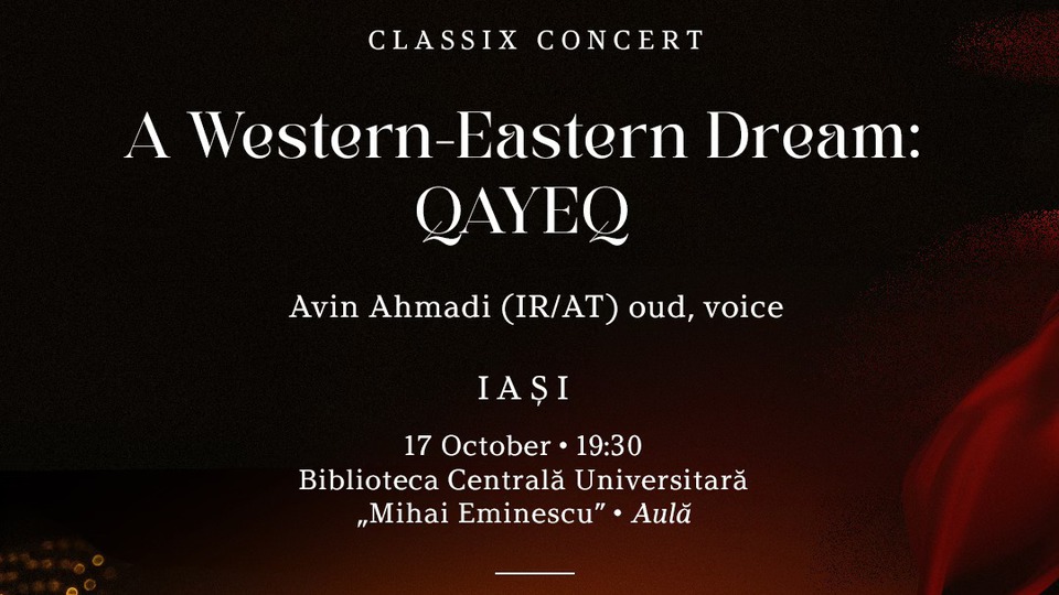 În cadrul seriei de concerte Classix, artista iraniană Avin Ahmadi, interpretă la oud, compozitoare și cântăreață, prezintă astăzi, 17 octombrie 2025, la Iași, proiectul "A Western-Eastern Dream: QAYEQ".