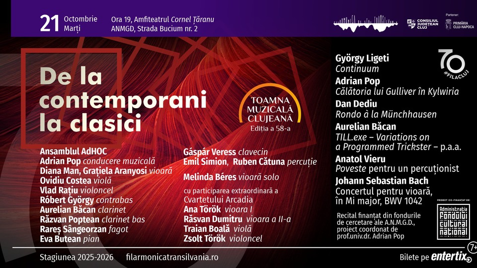 Astăzi, 21 octombrie 2025, va avea loc un nou concert înscris în agenda ediției cu nr. 58 a Festivalului "Toamna Muzicală Clujeană".