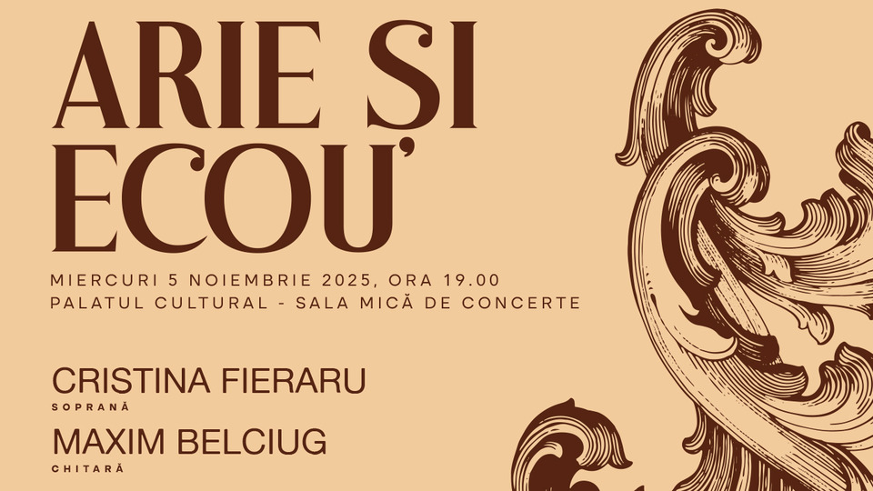 "Arie și Ecou" este titlul recitalului găzduit astăzi, 5 noiembrie 2025, de la ora 19.00, de Filarmonica din Arad. Pe scena mică a Palatului Cultural vor evolua soprana Cristina Fieraru și chitaristul Maxim Belciug.