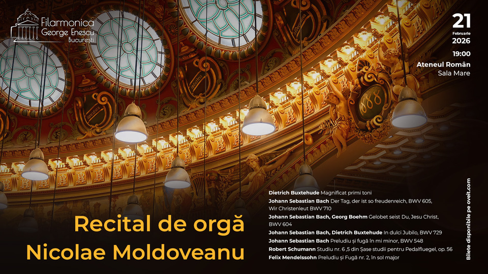Organistul Nicolae Moldoveanu evoluează pe scena Sălii Mari a Ateneului Român, aducând în atenția publicului lucrări din creația compozitorilor Dietrich Buxtehude, Johann Sebastian Bach, Robert Schumann și Felix Mendelssohn.