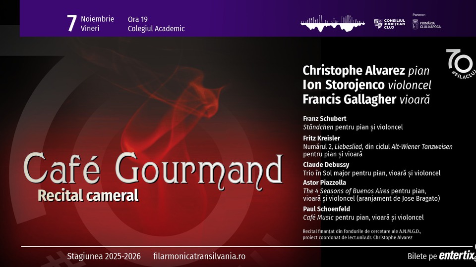 "Café Gourmand" se intitulează recitalul propus astăzi, 7 noiembrie 2025, de Filarmonica de Stat "Transilvania" din Cluj-Napoca.