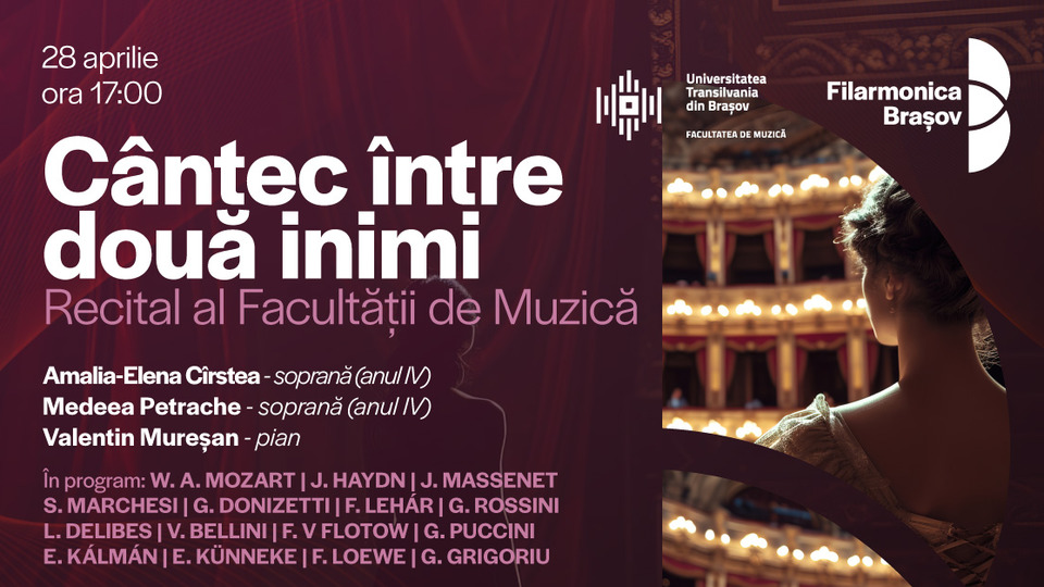 Sala Patria a Filarmonicii din Brașov găzduiește astăzi, 28 aprilie 2026, de la ora 17:00, un recital vocal intitulat „Cântec între două inimi”.