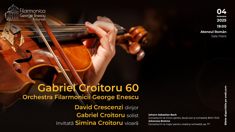 Sala Mare a Ateneului Român găzduiește astăzi, 4 noiembrie 2025, de la ora 19.00, un concert aniversar dedicat violonistului Gabriel Croitoru, sub semnul celor 60 de ani de viață și ai celor 40 de ani de carieră artistică.