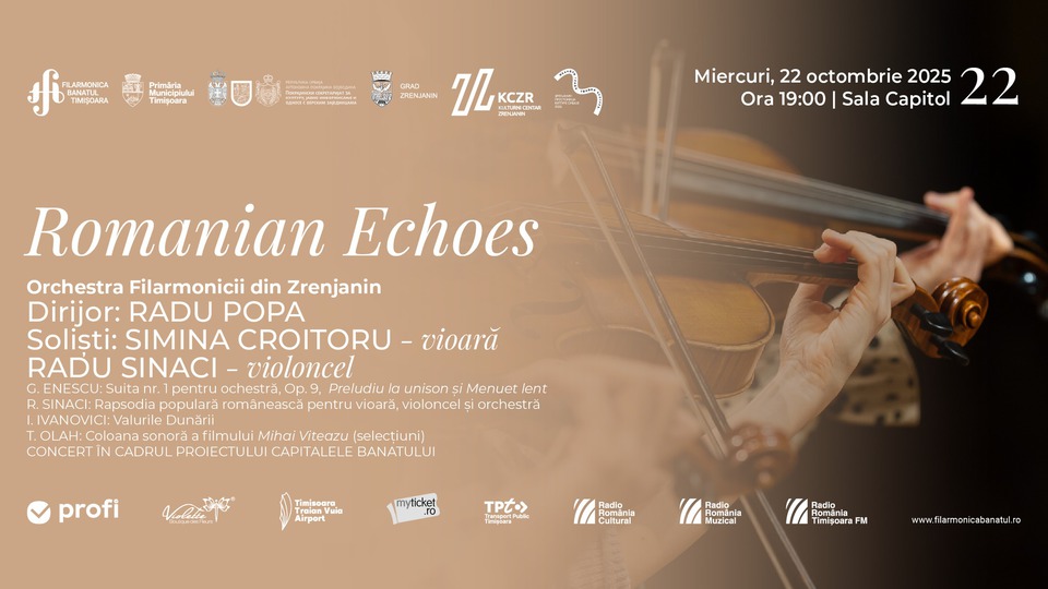 "Romanian Echoes" este titlul concertului propus astăzi, 22 octombrie 2025, la Timișoara, de Orchestra Filarmonicii din Zrenjanin, Serbia, condusă de dirijorul Radu Popa, alături de soliștii serii, violonista Simina Croitoru și violoncelistul Radu Sinaci.
