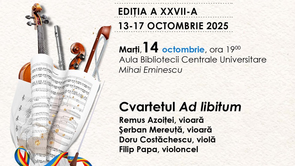 În cadrul Festivalului Muzicii Românești de la Iași, ce-și desfășoară ediția cu numărul XXVII, publicul este invitat astăzi, 14 octombrie 2025, la un recital cameral susținut de Cvartetul "Ad Libitum" al Filarmonicii ieșene.