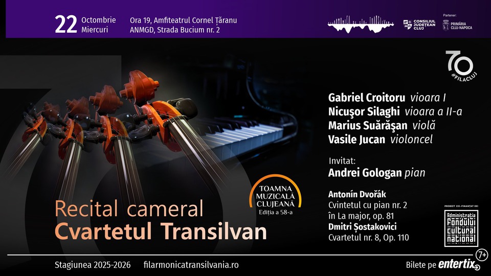 Festivalul "Toamna Muzicală Clujeană" prezintă astăzi, 22 octombrie 2025, un recital cameral susținut de Cvartetul "Transilvan", alături de pianistul Andrei Gologan.