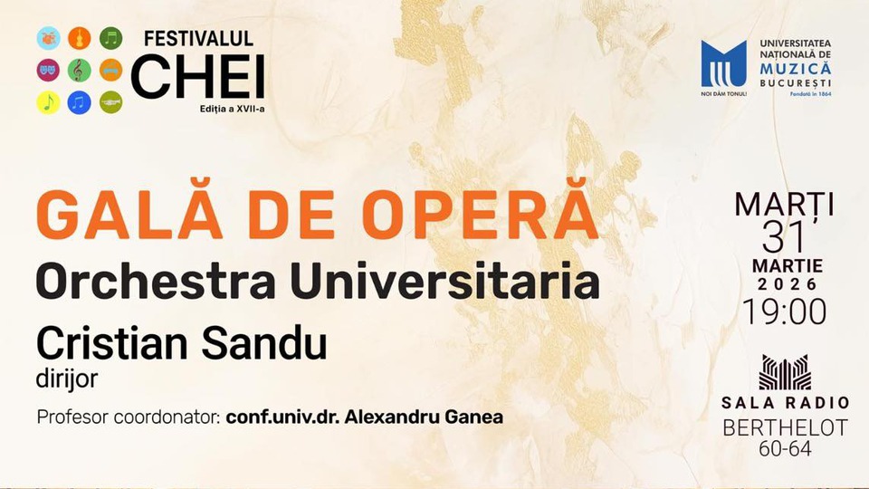 Cea de-a XVII-a ediție a Festivalului „Chei”, propus de Universitatea Națională de Muzică din București, continuă astăzi, 31 martie, cu o gală de operă realizată în coproducție de Centrul Cultural Media Radio România și Universitatea Națională de Muzică. Gala, care va reuni Orchestra „Universitaria” și Corul UNMB, va fi dirijată de Cristian Sandu, iar soliștii vor fi studenți selectați ai Departamentului Canto și Artele Spectacolului. În program: arii și scene din opere de Wolfgang Amadeus Mozart, Gioachino Rossini, Gaetano Donizetti, Giuseppe Verdi și Charles Gounod, între alții.