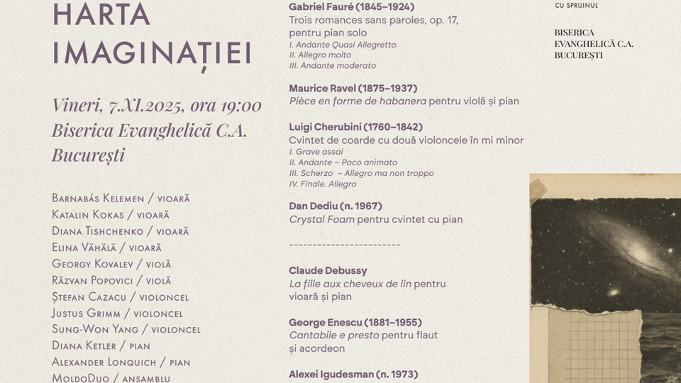 Sub genericul "Harta imaginației", vor fi prezentate publicului, începând cu ora 19:00, pagini semnate de Gabriel Fauré, Maurice Ravel, Luigi Cherubini, Dan Dediu, Claude Debussy, George Enescu și Alexei Igudesman.
