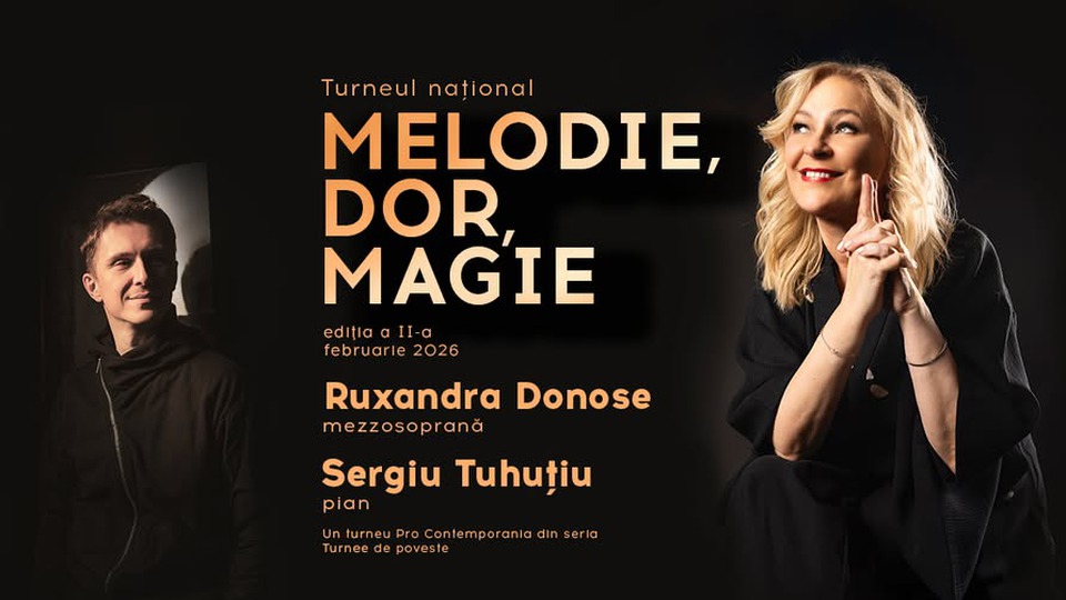 Turneului Național "Melodie, Dor, Magie" continuă astăzi, 22 februarie 2026, cu un recital susținut de mezzosoprana Ruxandra Donose și pianistul Sergiu Tuhuțiu pe scena Ateneului Român.