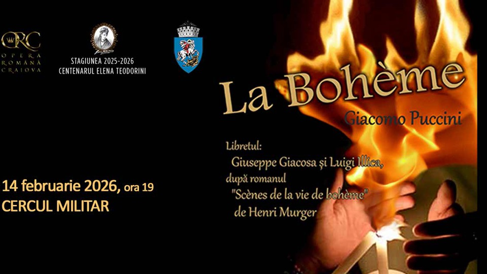 Opera Română din Craiova prezintă astăzi, 14 februarie, opera „Boema”, pe scena Cercului Militar. Din distribuție fac parte sopranele Tamara Kalinkina (Mimi) și Viktoria Romanova (Musetta), tenorul Alfonso Zambuto (Rodolfo), baritonul Enrico Marrucci (Marcello) și mulți alții. Participă Orchestra și Corul Operei Române Craiova, iar conducerea muzicală este asigurată de Adi Bar Soria. Ora de începere este 19:00.