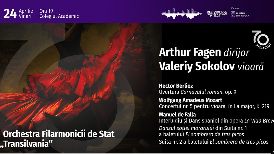Violonistul Valeriy Sokolov și dirijorul Arthur Fagen evoluează astăzi, 24 aprilie 2026, în compania Orchestrei Filarmonicii "Transilvania" din Cluj-Napoca.