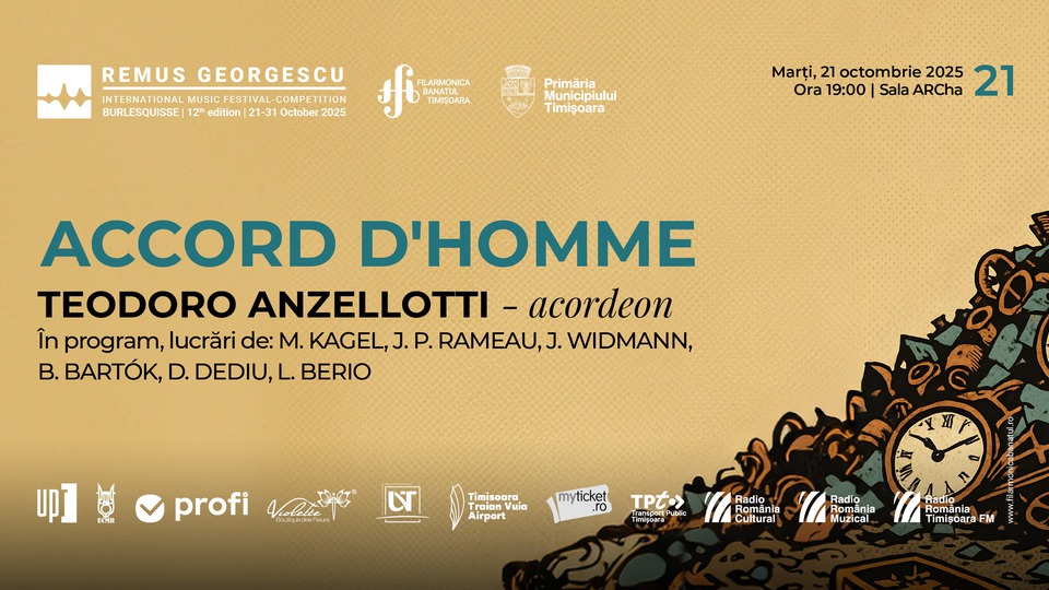 În cea de-a XII-a ediție a Festivalului-Concurs Internațional "Remus Georgescu", organizat de Filarmonica "Banatul" din Timișoara, va avea loc astăzi, 21 octombrie 2025, un recital de acordeon susținut de Teodoro Anzellotti din Italia.