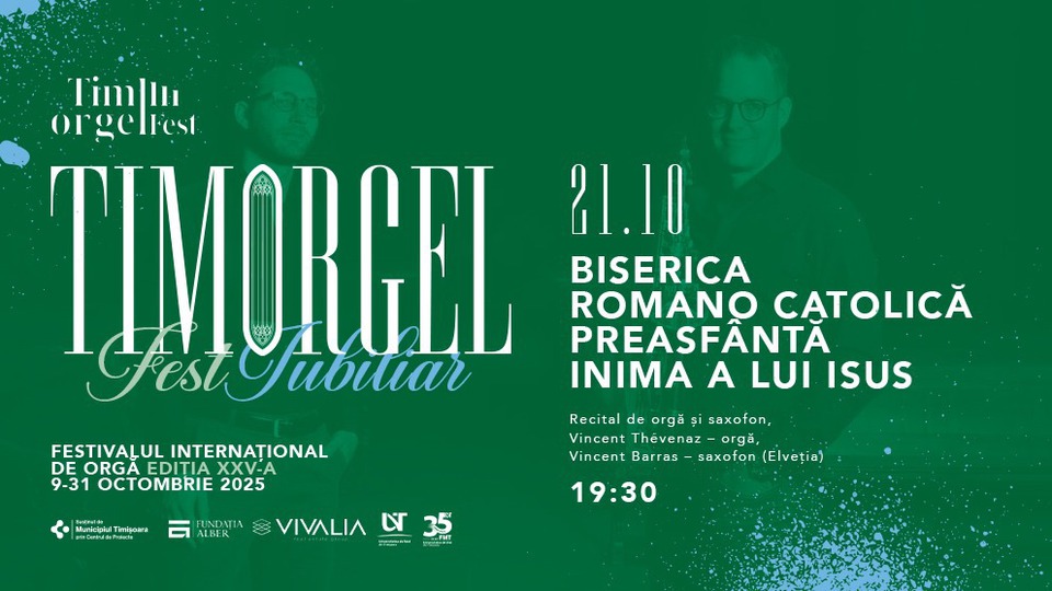 Ediția cu numărul 25 a Festivalului Internațional de Orgă TimOrgelFest de la Timișoara propune astăzi, 21 octombrie 2025, un recital susținut de organistul Vincent Thévenaz și Vincent Barras la saxofon. Programul este prezentat la Biserica Romano-Catolică „Preasfânta Inimă a lui Isus” din localitate și include pagini semnate de Benedetto Marcello, Susanne van Soldt, Béla Bartók și Astor Piazzolla, printre alții. Ora de începere este 19:30.