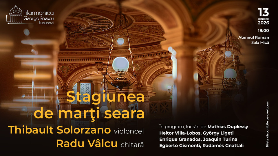 Astăzi, 13 ianuarie 2026, de la ora 19:00, în Sala Mică a Ateneului Român se desfășoară un nou recital cameral înscris în Stagiunea de marți seara a Filarmonicii „George Enescu". Thibault Solorzano la violoncel și Radu Vâlcu la chitară vor intepreta lucrări de Mathias Duplessy, György Ligeti, Enrique Granados și Joaquin Turina, printre alții.