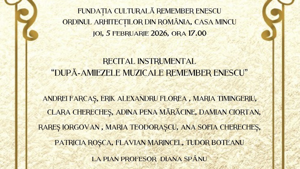 Un recital instrumental din seria "După-amiezele muzicale Remember Enescu" se va desfășura astăzi, 5 februarie 2026, la Casa Mincu din București.