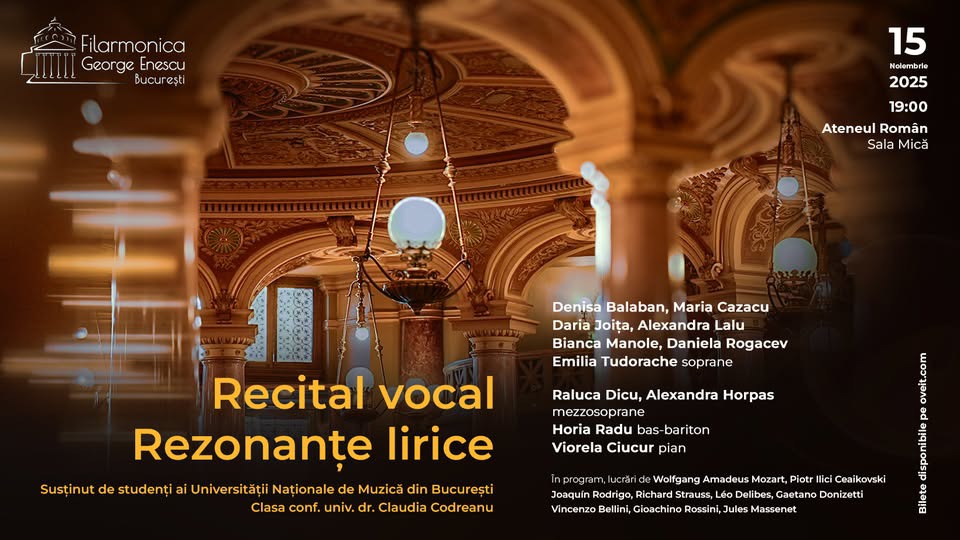 "Rezonanțe lirice" este titlul recitalului vocal care se desfășoară astăzi, 15 noiembrie 2025, la Filarmonica "George Enescu", în Sala Mică, începând cu ora 19:00. În cadrul evenimentului, vor evolua studenți ai Universității Naționale de Muzică din București, de la clasa conf. univ. dr. Claudia Codreanu. Sopranele Denisa Balaban, Maria Cazacu, Daria Joița, Alexandra Lalu, Bianca Manole, Daniela Rogacev și Emilia Tudorache, mezzosopranele Raluca Dicu și Alexandra Horpas și bas-baritonul Horia Radu sunt artiștii lirici pe care publicul îi va putea asculta. Aceștia vor cânta alături de pianista Viorela Ciucur. În program se regăsesc lucrări de Wolfgang Amadeus Mozart, Piotr Ilici Ceaikovski, Joaquín Rodrigo, Richard Strauss, Léo Delibes, Gaetano Donizetti, Vincenzo Bellini, Jules Massenet și Gioachino Rossini.