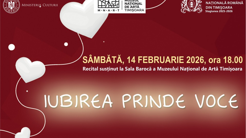 Astăzi, 14 februarie, de la ora 18:00, la sala Barocă a Muzeului Național de Artă Timișoara are loc recitalul "Iubirea prinde voce", susținut de artiștii Operei Naționale Române din oraș. Programul cuprinde lucrări de Wolfgang Amadeus Mozart, Giacomo Puccini, Gioachino Rossini, Giuseppe Verdi și mulți alții. Acompaniază la pian Angela Balici și Leonard Bonea.