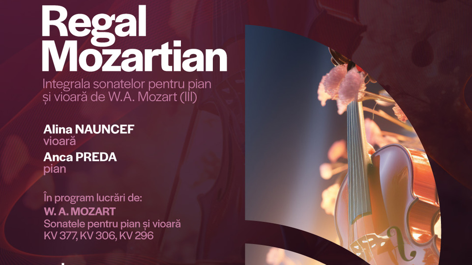 Începând cu ora 19.00, în Sala Mică a instituției, violonista Alina Nauncef și pianista Anca Preda vor susține un recital din seria dedicată integralei sonatelor pentru vioară și pian de Wolfgang Amadeus Mozart. În această seară, vor interpreta trei sonate: nr. 25 în Fa major KV 377, nr. 23 în Re major KV 306 și nr. 17 în Do major KV 296.