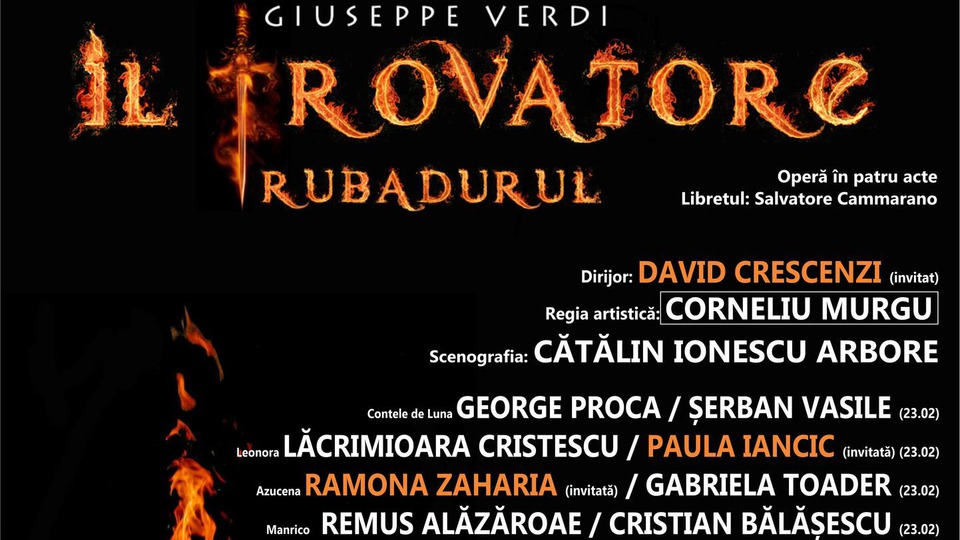 "Trubadurul" de Giuseppe Verdi este spectacolul programat astăzi, 22 februarie 2026, la Opera Națională Română din Timișoara.